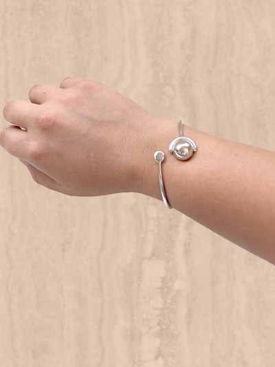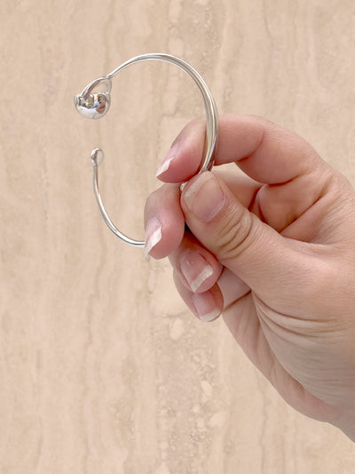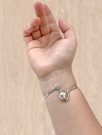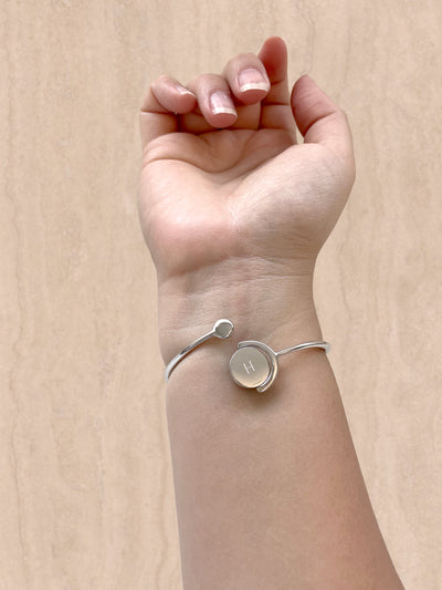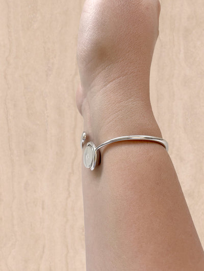 After opening the bracelet, slip the bracelet on at the wrist. We find it easiest to approach the arm at the side of our wrist. With the flat part of the dome against your skin, your bracelets are ready for everyday wear. To activate acupressure relief continue to step 3.