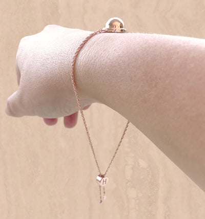 Slide the “H” logo bead to the end of the chains so you can slip your wrist through the bracelet easily.